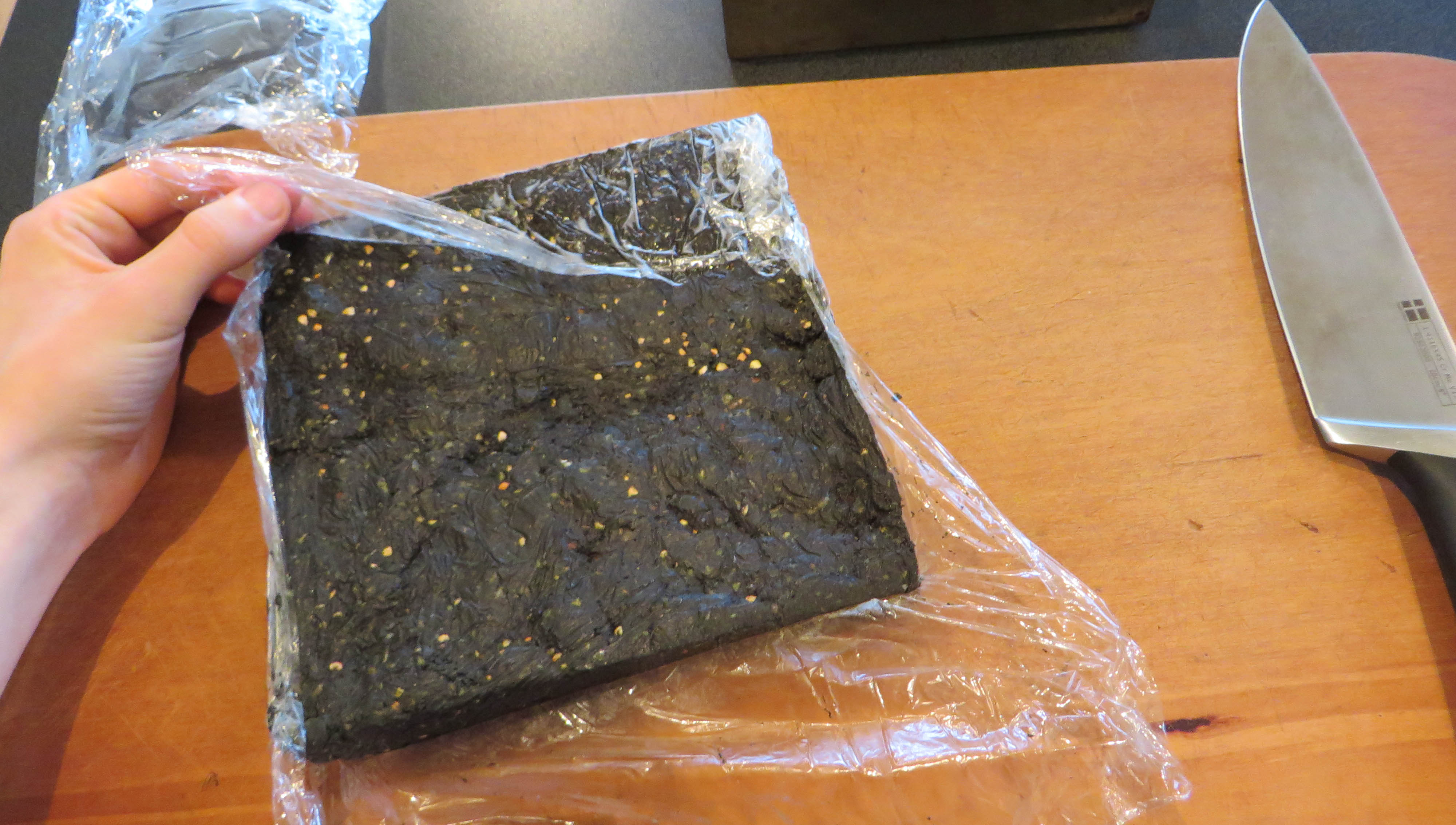 Line a baking dish with cling wrap or baking paper and press the mix evenly into it, placing another piece of wrap/paper on top to press it out smoothly. Pop into the freezer for about 30 minutes to chill, then slice into 16 pieces.
